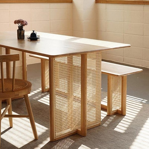 Made from ash esche wood and rattan, this table balances natural materials with a streamlined silhouette. Legs need to be fitted as part of assembly.