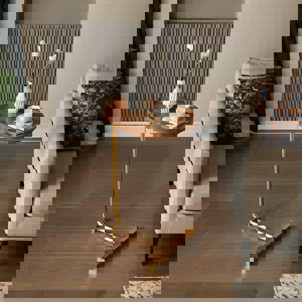 The Weilai Concept Isabeau Side Table is a narrow, contemporary piece designed to fit neatly into tighter spaces around the home. With its sleek, C-shaped design, it can be positioned alongside a sofa or bed for convenient everyday use, while the top provides a practical spot for essentials.