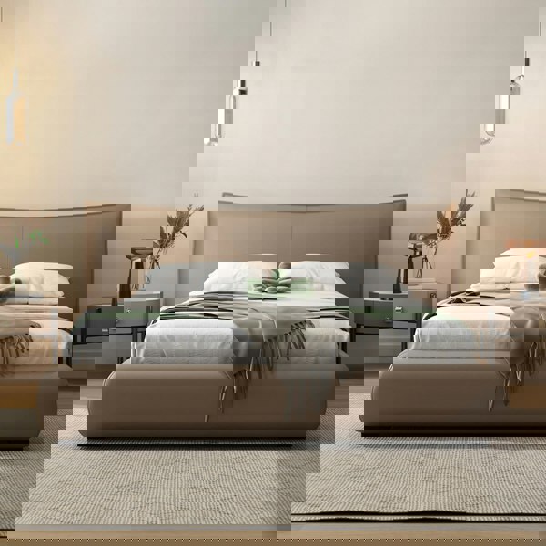 Made with a combination of real leather on the contact surface of the headboard and PU leather, the bed is supported by a solid wood and steel structure, with high density sponge included as part of the upholstered design. Choose from khaki, white, or black to suit your interior scheme.