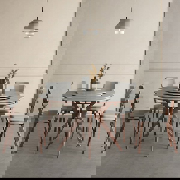 Finished in grey and walnut, this set combines a mix of materials across the table and chairs. The table is made from ash wood, multiply-solid wood and sintered stone, while the chairs pair oak wood with PU leather and high density sponge for a structured sit.