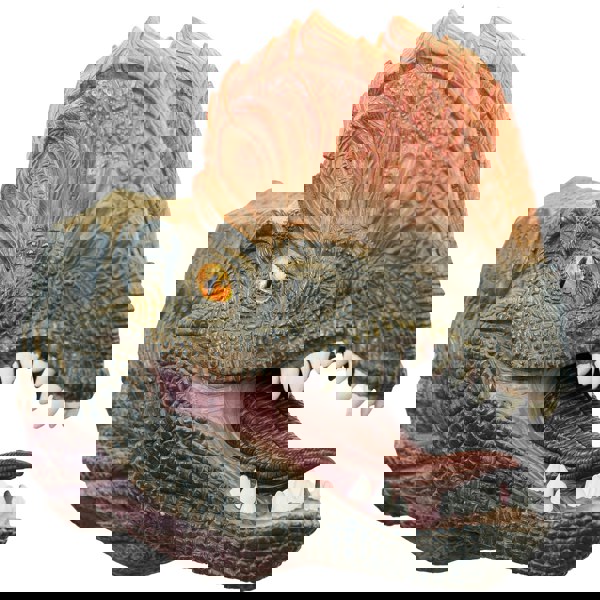 A roar-some Dilophosaurus hand puppet with very realistic, lifelike features.