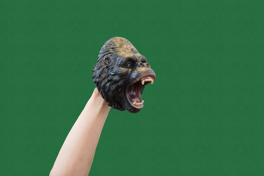 A wonderful gorilla hand puppet with very realistic, lifelike features.