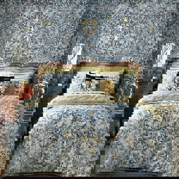 William Morris designed African Marigold in 1876. The pattern features small marigolds with larger stylised lilies and curling ribbons of acanthus leaves. Morris's working process is revealed in the original design drawing, where alterations and rubbed-out lines are visible. Morris drew, revised and finally coloured a pattern on a single sheet of paper, believing that a harmonious piece of work should be done in one attempt. The original design is in the William Morris Gallery's collection as well as 23 original printing blocks. Immerse yourself into an oasis of tranqulity through this mesmerising Morris design.