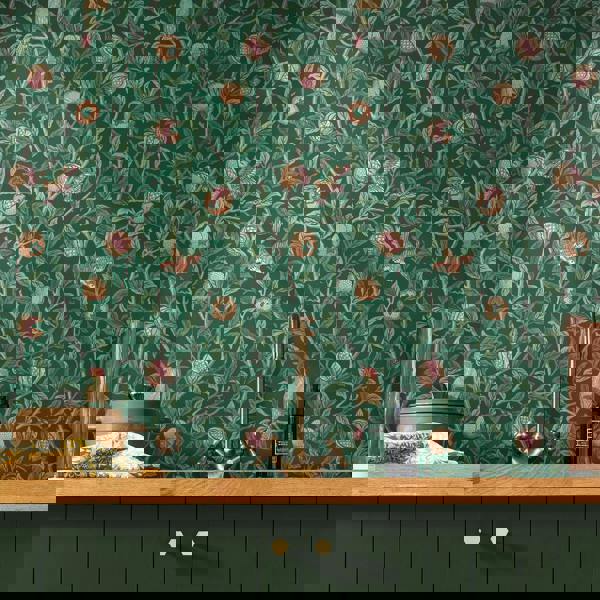 Bird and Pomegranate Deep Green is a beautiful, statement design with it's vivid richness in colour. Displaying pops of muted terracotta, rosey pink and cream, against a multi-tonal sea of green. This matt finish wallpaper would be an eye catching asset to any room.