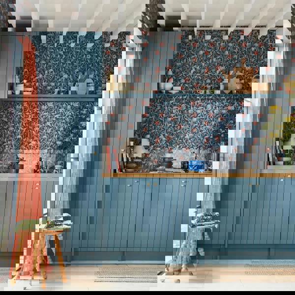 A beautiful and dynamic Morris design featuring perching and swooping birds against a network of foliage and an abundance of ripe pomegranates - some whole, some bursting open and others getting pecked at by diving birds. The inspiration for this piece was William Morris's much earlier pattern, 'Fruit', which similarly depicts luscious pomegranates amongst branches, leaves and blooming pomegranate flowers. With nature the focus, this vibrant and whimsical design is a fine exemplar of Morris's characteristic style. Bird and Pomegranate Navy Blue displays a rich navy blue backdrop, overlaid with soft coral pinks, cream, teal tones and beige brown, with charcoal grey details. This wallpaper comes in a matt finish, giving this classical Morris design a modern twist.