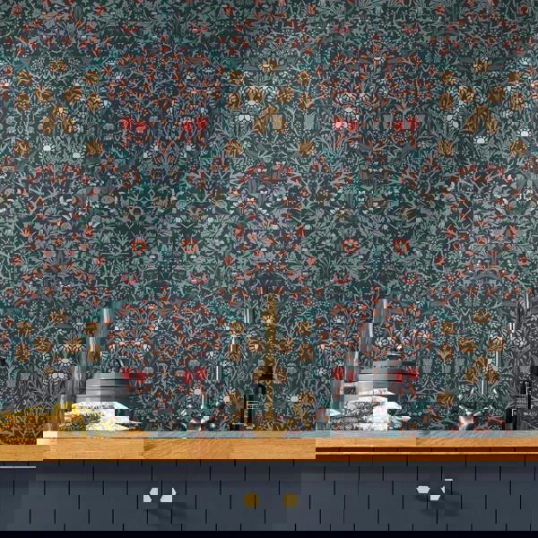 Designed in 1892, Blackthorn was originally block-printed and features white blackthorn (or sloe) blossom and violets with meadow flowers of red snakes head fritillaries and yellow daisies. The flowers bloom from a lattice of curling foliage, leaves, and stems in this iconic Morris pattern. Typical of Morris' work, Blackthorn is a celebration of the beauty of nature.