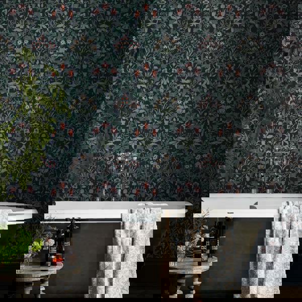 In this Midnight colourway, the design takes on a rich, elegant feel. The deep navy-blue backdrop sets the tone for soft sage greens, coral reds, and blush pink florals to unfold across the surface with quiet drama. The result is a palette that feels timeless and immersive, ideal for rooms where mood and depth are key to the atmosphere. Printed on high quality non-woven wallpaper, Celandine Midnight combines bold beauty with easy application, simply paste the wall and enjoy a timeless statement.