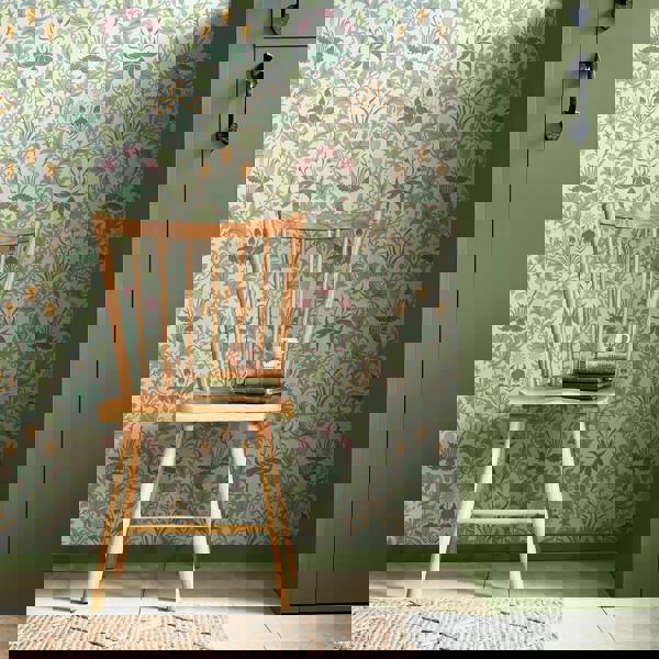 This charming, characterful design features delicate meadow flowers including bluebells, campanula, pink flowers and celandine, intricately arranged amongst a trellis of intertwining vines. Celandine was designed by William Morris's chief designer, John Henry Dearle around 1896 and is reminiscent of one of William Morris' earliest wallpaper designs, Daisy, with its soft yet intricate detailing and graceful composition, embodying the timeless beauty of nature.