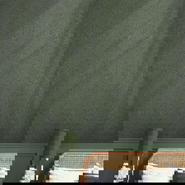 Morris also registered the design as a printed cotton later in 1875, one of only three designs Morris specifically intended to be produced as both a textile and a wallpaper. Marigold fibrous green perfectly showcases Morris' famous design with a full black metallic print on a gorgeous deep green, textured background. This luxurious design adds an eye-catching element to this duo- toned wallpaper, making this the perfect choice for a sophisticated feel.