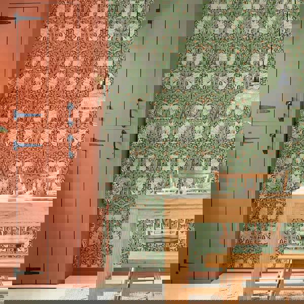 The Gallery's archive includes an original Pimpernel hand block printed wallpaper length. Pimpernel Green features the finest of natures colour palette, with rich emerald and light tone greens, accented by cream toned champagne feature flowers alongside smaller terracotta flowers. The matt finish of this wallpaper adding stillness and solidarity, making it the ideal choice to fill any calm space.