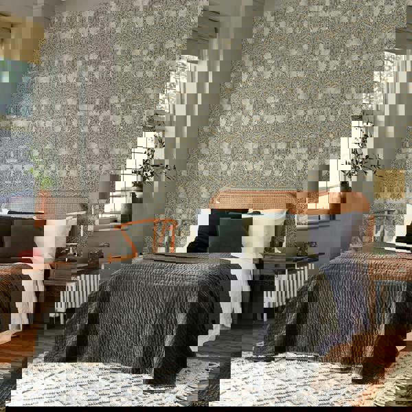 The Gallery's archive includes an original Pimpernel hand block printed wallpaper length. Pimpernel Grey displays a depth of detail through its multi-tonal palette of grey hues, subtly accentuated by notes of gold represented in the flowers featured weaving throughout. This wallpaper comes in a matt finish, adding a contemporary feel to a classical design.