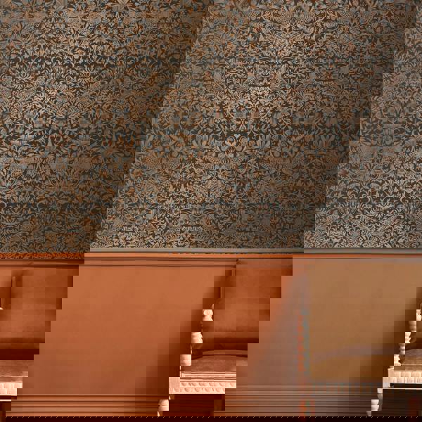 Whilst waiting to see the first piece printed, Morris endured sleepless nights in his lodgings at Merton Abbey. Designed in 1883, Strawberry Thief remains one of William Morris's most popular and iconic designs. Strawberry Thief Fibrous Charcoal presents Morris' famous design in a beautiful metallic copper print, giving texture and intrigue. Complimenting the textured, matt charcoal background of this wallpaper.