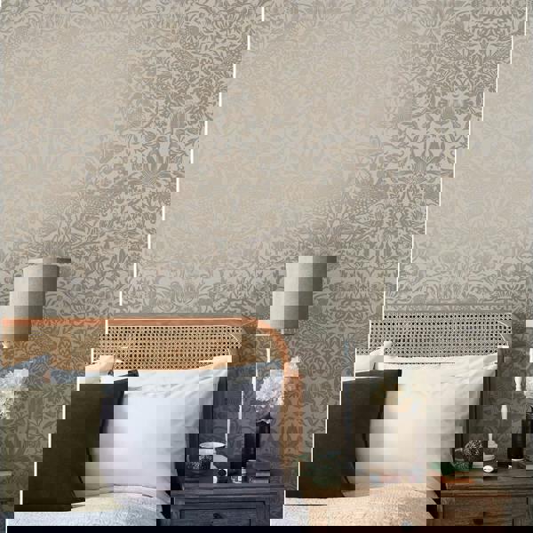 Whilst waiting to see the first piece printed, Morris endured sleepless nights in his lodgings at Merton Abbey. Designed in 1883, Strawberry Thief remains one of William Morris's most popular and iconic designs. Strawberry Thief Fibrous Neutral presents Morris' famous design in a beautiful metallic bronzed gold, giving texture and intrigue. Complimenting the textured, matt neutral, background of this wallpaper.
