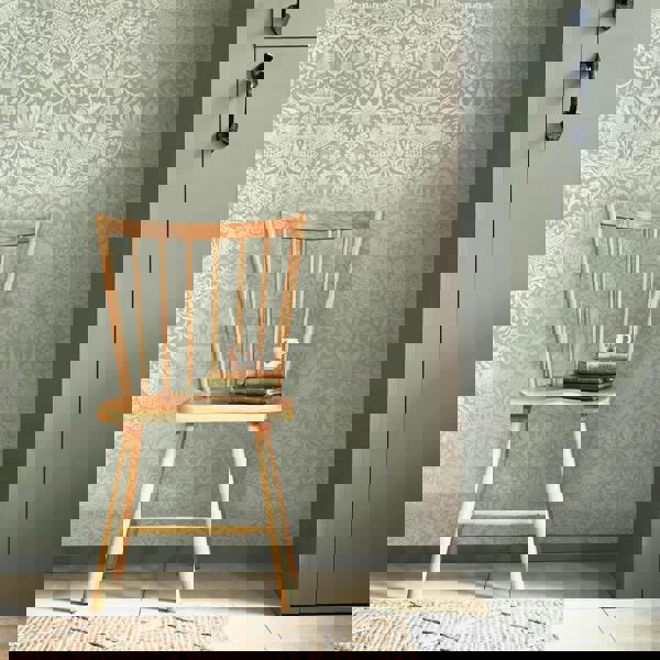 Designed in 1883, Strawberry Thief remains one of William Morris's most popular and iconic designs. Strawberry Thief Fibrous Sage presents Morris' famous design in a beautiful metallic soft gold print, giving texture and intrigue. Complimenting the textured, matt sage green background of this wallpaper.