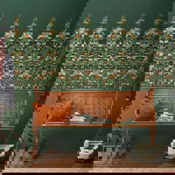 Strawberry Thief Green mural brings the outdoors in, with accents of blush and mustard yellow overlayed upon a bottle green backdrop, promoting the pop of off-white within the flower and bird motifs. Printed on a beautiful matt substrate finish for a sleek and sophisticated look. This mural comes in a 4x2. 5 metre size.