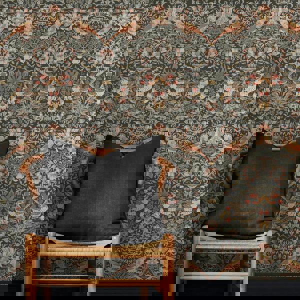 Designed in 1883, Strawberry Thief remains one of William Morris's most popular and iconic designs. Strawberry Thief Charcoal features subtle pastel tones of rose, greys and white, contrasted by a deep charcoal background, providing an intriguing yet inviting contrast. The matt finish of this wallpaper also enhances the contemporary twist brought out of this classical design.