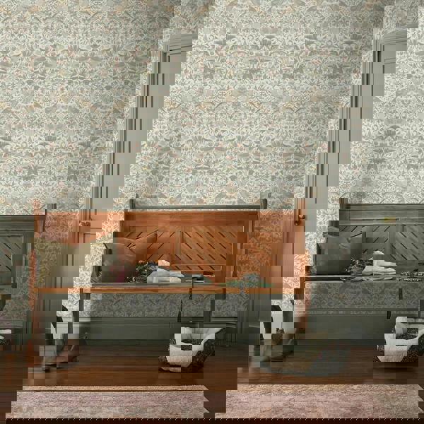Perhaps William Morris's most recognisable design, Strawberry Thief was inspired by the thrushes that crept under Morris's strawberry nets in his garden at Kelmscott Manor, Oxfordshire. The original pattern took several days to print using hand-carved woodblocks to build up the different colours, and 'Strawberry Thief' was consequently one of Morris's firm's most expensive cottons. Whilst waiting to see the first piece printed, Morris endured sleepless nights in his lodgings at Merton Abbey. Designed in 1883, Strawberry Thief remains one of William Morris's most popular and iconic designs. Strawberry Thief Sage and Pink matt finish wallpaper combines delicate neutral tones of blush and sage, creating a delightfully quaint atmosphere within any room.