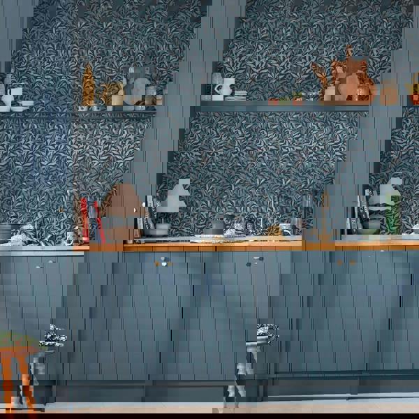 This iconic pattern forms a part of The Gallery's collection in earlier printed chintz and wallpaper lengths. The design is based on the natural willow form which was one of William Morris' favourite motifs. Originally designed by William Morris as a wallpaper in 1887 and adapted for fabric in 1895, it is block printed in a diagonal branch pattern at Merton Abbey and combines abstraction with a gentle reminder to the outdoors. Willow Bough Deep Blues wallpaper holds a more subtle stance, trailing leaves are displayed in shades of dusky navy blue, teal and light pastel blue, created on a beautiful matt finish.