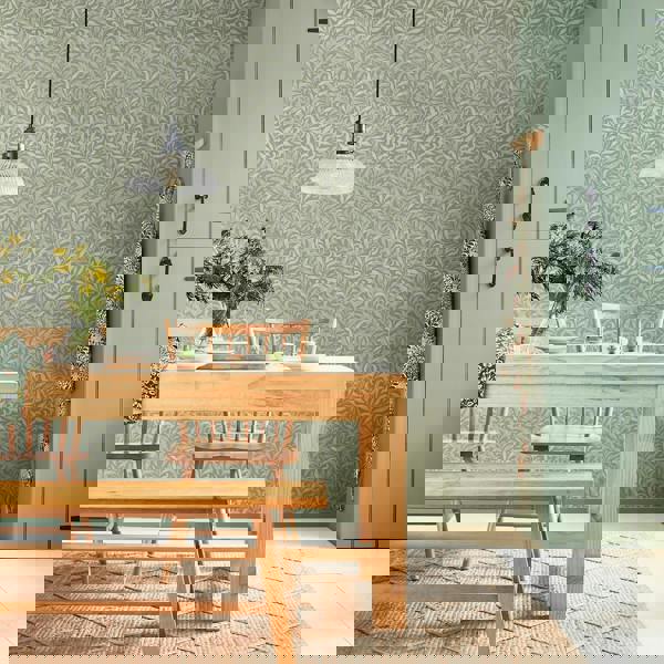 This iconic pattern forms a part of The Gallery's collection in earlier printed chintz and wallpaper lengths. The design is based on the natural willow form which was one of William Morris' favourite motifs. Originally designed by William Morris as a wallpaper in 1887 and adapted for fabric in 1895, it is block printed in a diagonal branch pattern at Merton Abbey and combines abstraction with a gentle reminder to the outdoors. Willow Bough Sage creates an atmosphere of elegance with trailing leaves in a soft off white, light grey and sage on a muted light olive background. This matt finish wallpaper creates a calm and quaint feel, making it a lovely addition to any home.