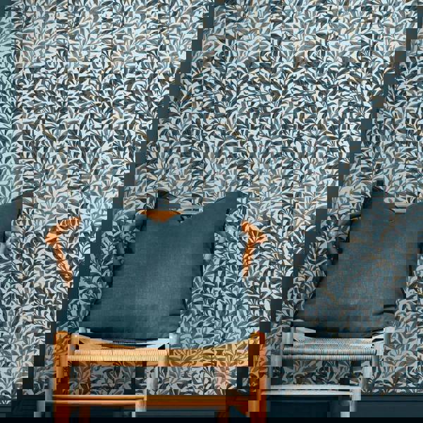 This iconic pattern forms a part of The Gallery's collection in earlier printed chintz and wallpaper lengths. The design is based on the natural willow form which was one of William Morris' favourite motifs. Originally designed by William Morris as a wallpaper in 1887 and adapted for fabric in 1895, it is block printed in a diagonal branch pattern at Merton Abbey and combines abstraction with a gentle reminder to the outdoors. Willow Bough white and blues carries an understated charm, the beautiful trailing laves in a dusky navy blue and pastel blue tones are perfectly laid upon a white background, making it an easy choice to add flare to any room. This wallpaper also comes in a matt finish, to give this well loved design a contemporary spin.