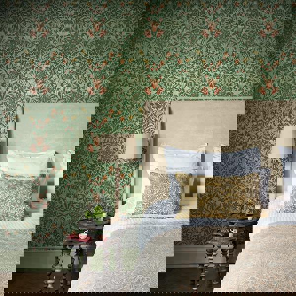William Morris championed nature, and his designs were commonly asymmetric to reflect the organic imperfections of the natural world. Woodland Weeds, however, is curiously symmetrical. The design features a variety of small flowers, vines and leaves interwoven in a beautiful and detailed arrangement. This highly decorative pattern is reminiscent of medieval millefleur, an artistic method of filling the background of paintings or textiles with abundant tiny flowers, flora and fauna; a technique Morris is known to have admired.