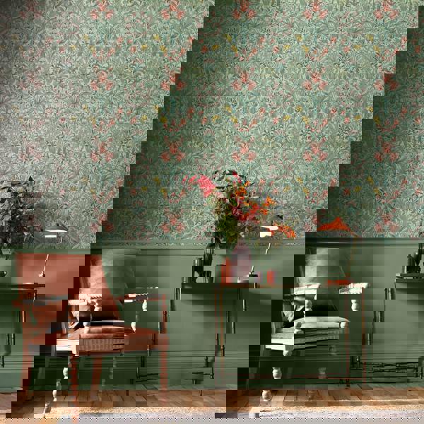 William Morris championed nature, and his designs were commonly asymmetric to reflect the organic imperfections of the natural world. Woodland Weeds, however, is curiously symmetrical. The design features a variety of small flowers, vines and leaves interwoven in a beautiful and detailed arrangement. This highly decorative pattern is reminiscent of medieval millefleur, an artistic method of filling the background of paintings or textiles with abundant tiny flowers, flora and fauna; a technique Morris is known to have admired.