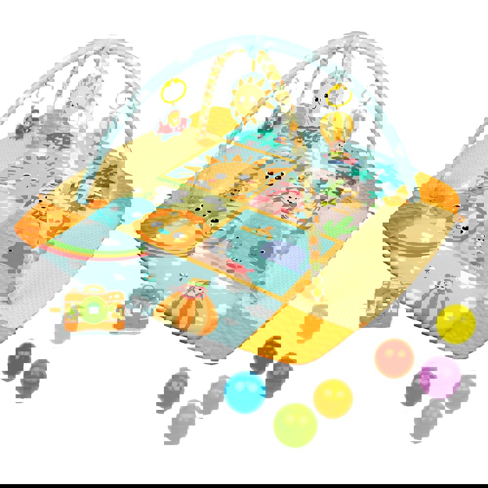 Adding extra excitement, the WinFun Travel Fun Deluxe Gym includes a detachable electronic toy camera that plays fun sounds, cheerful melodies, and flashes lights, captivating baby’s attention. Five colourful balls are also included, adding another dimension to playtime. This activity gym encourages reaching, grasping, and batting, helping to develop gross and fine motor skills, hand-eye coordination, and sensory awareness. It offers a safe and entertaining space for your baby to grow and explore.