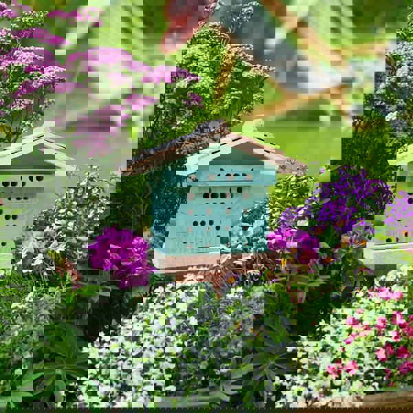 Encourage pollinators into your garden with this decorative wooden bee house, designed to provide a safe nesting space for solitary bees. Crafted from natural wood and finished in a soft green tone, the layered structure features multiple pre-drilled holes to support species such as mason bees and leafcutter bees.