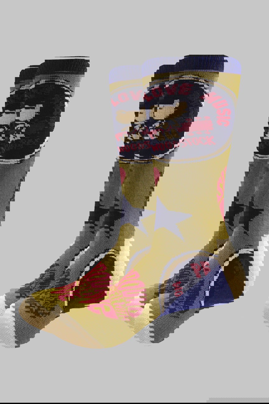 Official licensed Woodstock Unisex Ankle Socks featuring the 'Peace - Love - Music' design motif. This high quality Ankle Socks is available in a green colourway. These premium quality, colourful, all-over pattern cotton rich woven socks are guaranteed to stand out in the crowd. UK adult shoe sizes approx. 7 - 11 (EUR Shoe size 40 - 45 and US Men's Shoe Size 8 - 12).
