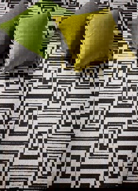 Elevate your interior with the Wool Labyrinth Rug in White and Black, featuring a bold geometric pattern that brings structure and sophistication to any room.