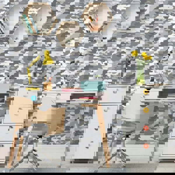 World of Wallpaper Camouflage Wallpaper - Grey features a camouflage design in a grey colourway, finished with a textured surface for added visual interest. Designed for straightforward use, it is described as easy to apply, making it a practical choice for updating a room with a distinctive patterned look.