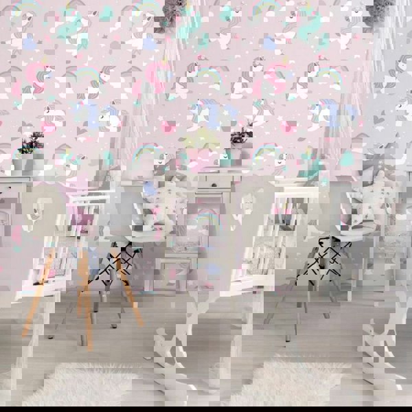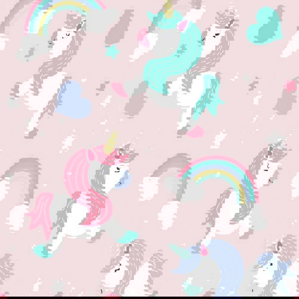 Bring a playful look to your space with the World of Wallpaper I Believe In Unicorns Wallpaper in pink. Featuring a lively mix of hearts, rainbows, stars and unicorns, this design is ideal for adding character to a room while keeping the overall finish soft and understated.
