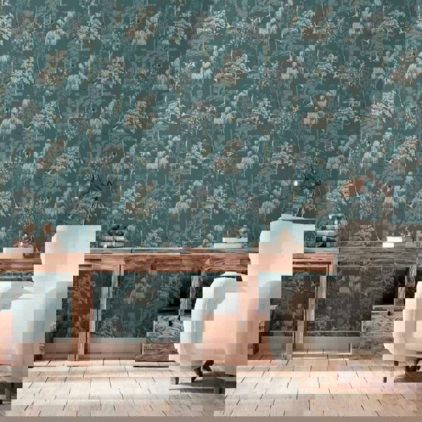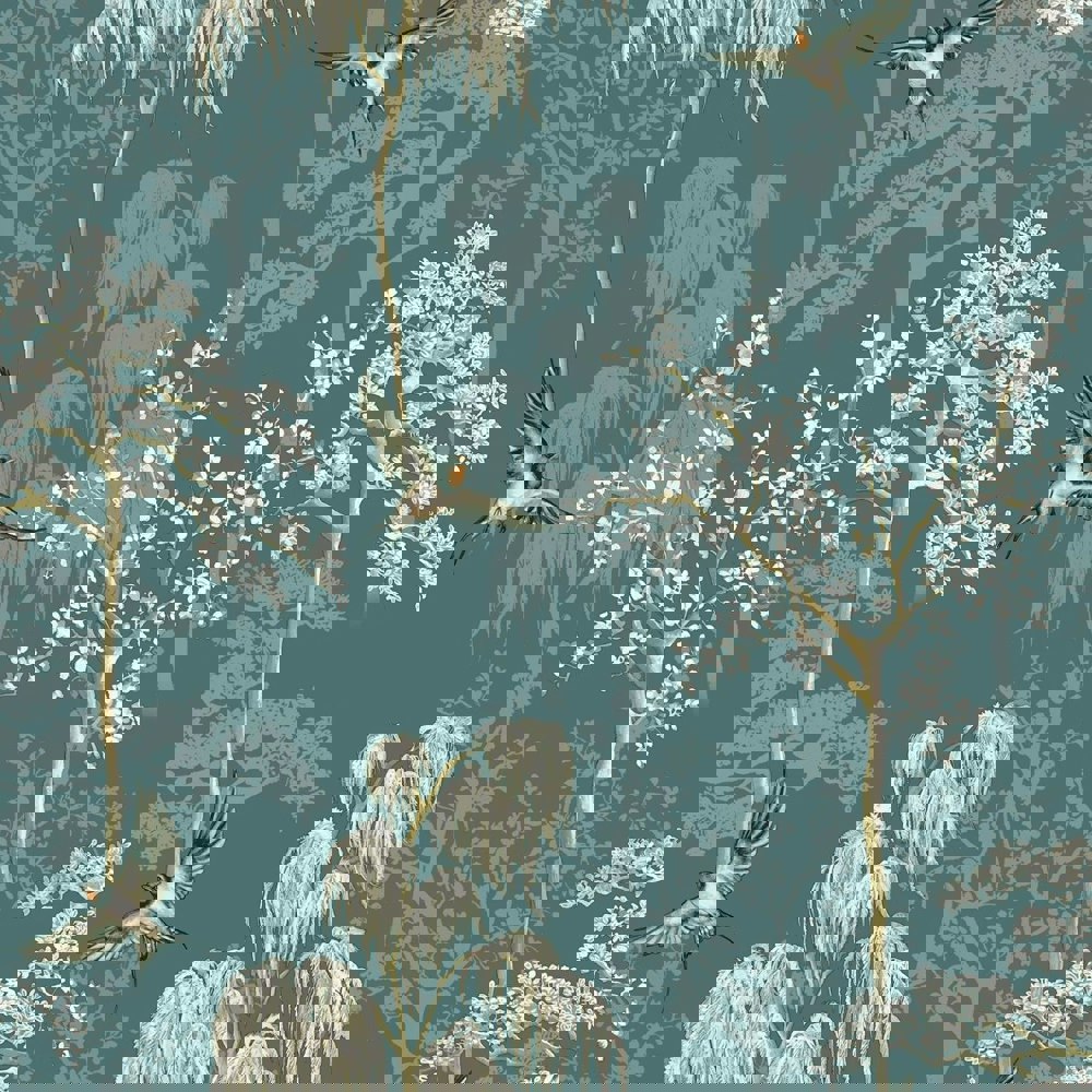 World Of Wallpaper Japanese Garden Wallpaper - Teal features a decorative Japanese garden-inspired design with birds, cherry blossom and wisteria trees, finished with a smooth, pearlescent look. The teal colourway brings a distinctive backdrop to a room, while the repeating pattern helps create a consistent finish across larger areas.