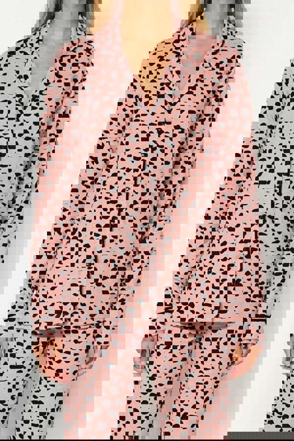 Bold pattern meets everyday ease in the WOVCOR 2-piece leopard print pyjama set. Made from 100% cotton, it brings a breathable feel to nights in and slower mornings. The set pairs a soft shirt with matching knit trousers, creating a coordinated look that suits both sleep and lounging.