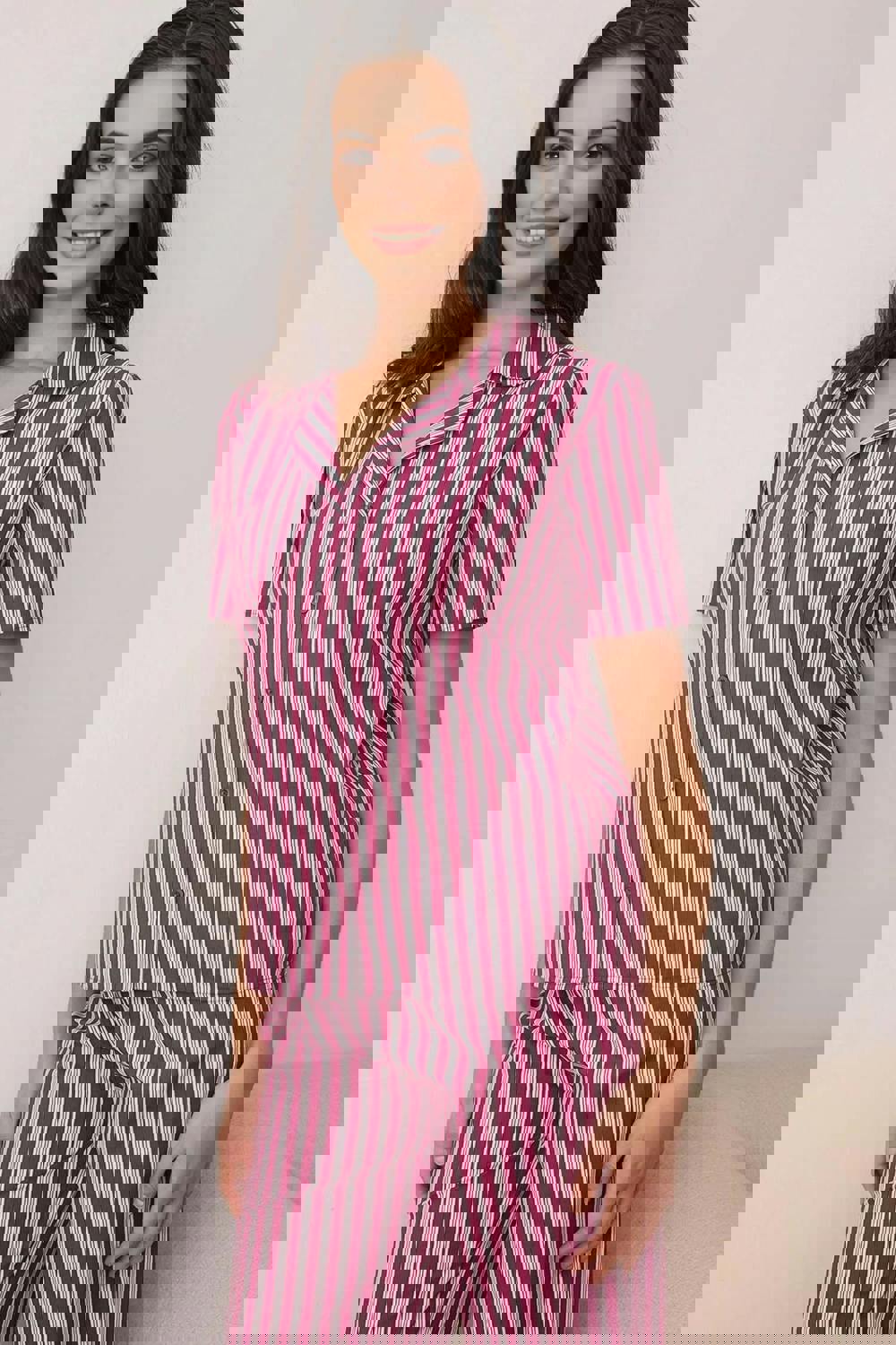 The set comes as a two-piece and is finished in a timeless stripe, keeping the overall look simple and considered. An easy choice for those who prefer cotton sleepwear with a crisp poplin handle.