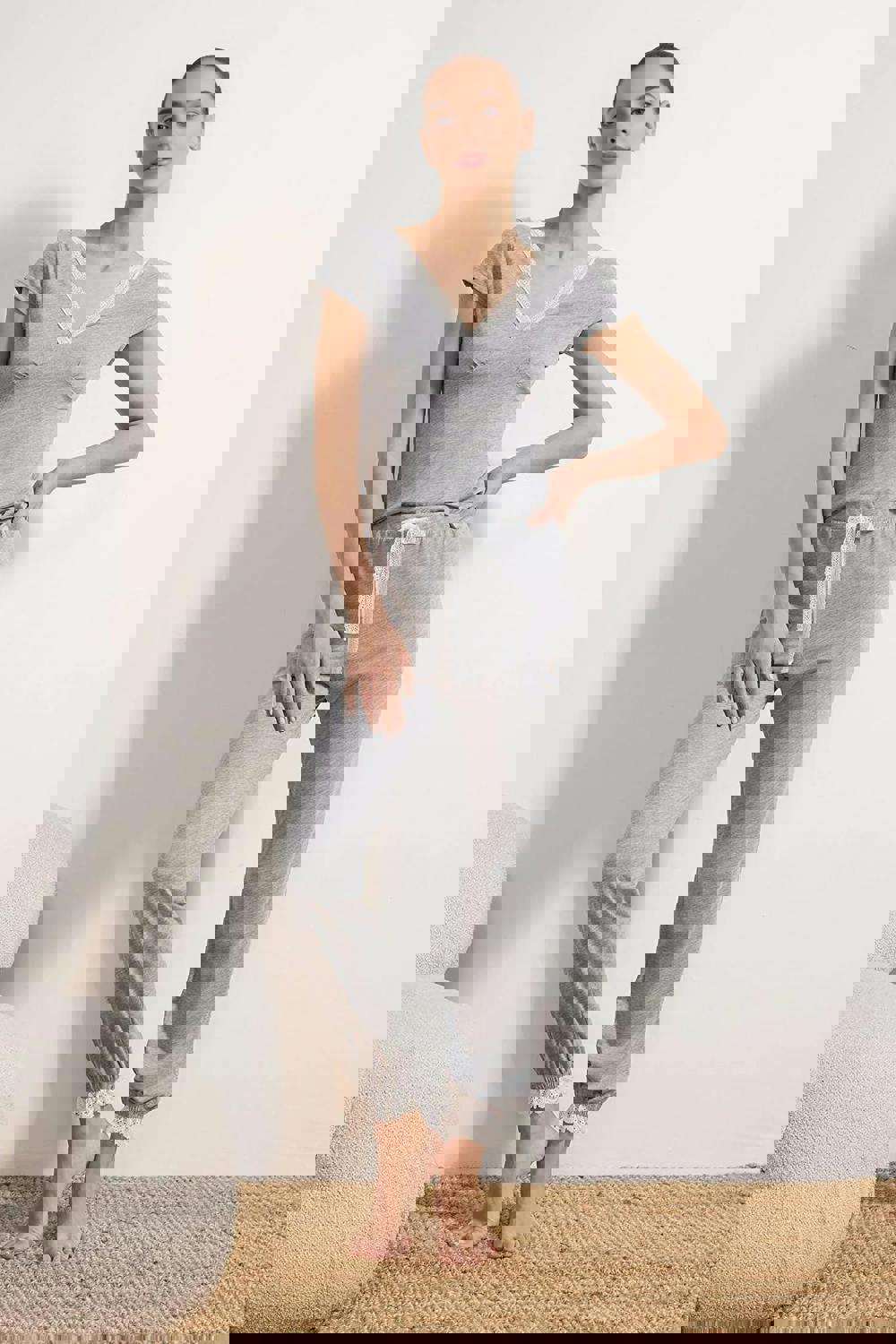 The composition blends cotton and polyester, offering a breathable feel for sleep and an easy, put-together appearance for downtime. With its refined trims and thoughtful construction, it’s a versatile addition to a night-time wardrobe.