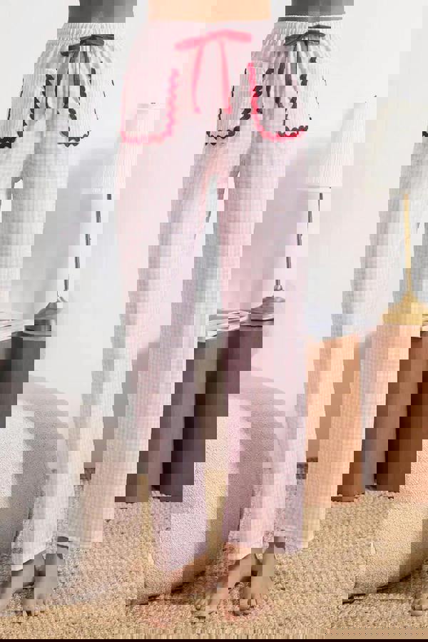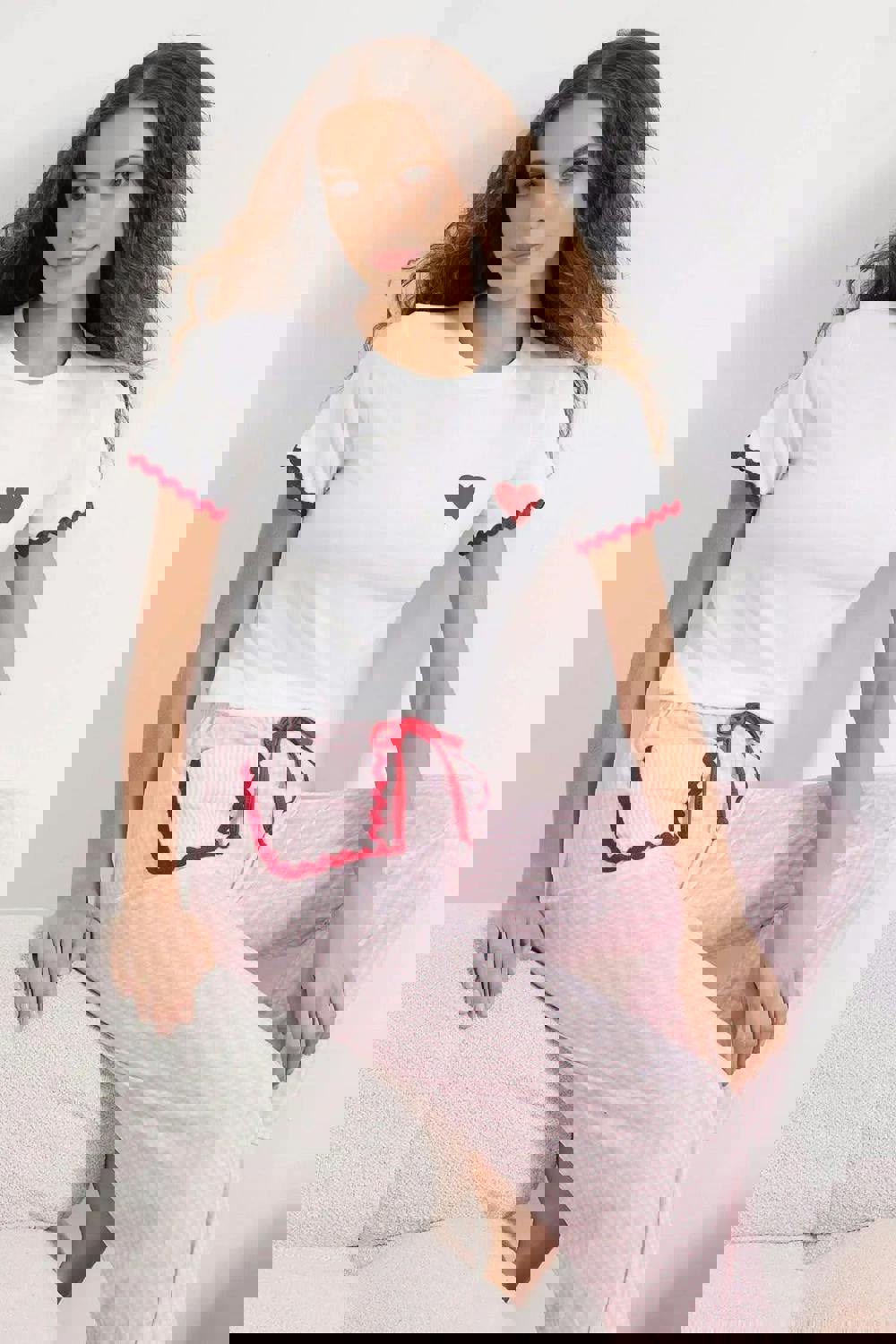 WOVCOR’s 2-piece Plaid Heart Stripe Detail Knitted Pajama Set is made from a premium blend of 95% polyester and 5% elastane. The knitted construction is paired with plaid and heart stripe patterns, bringing a considered look to a coordinated sleepwear set.