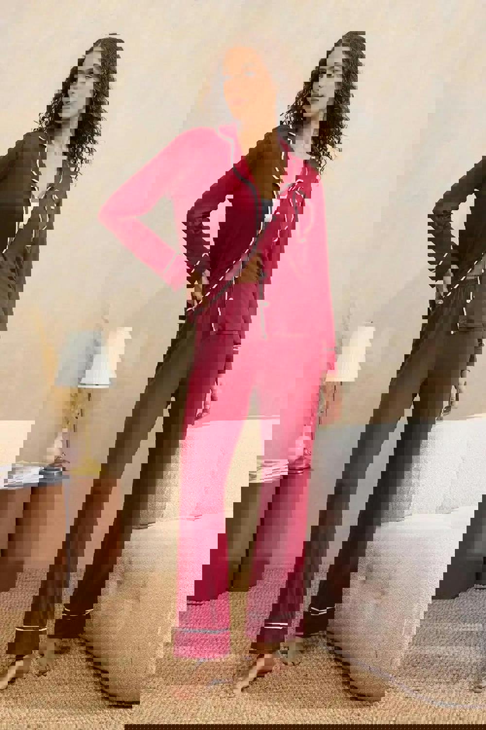 WOVCOR’s 2-piece viscose knit pyjama set brings a considered finish to everyday sleepwear. Made in a knit construction with heart detailing and piped trim, it offers a neat, coordinated look for winding down at home.
