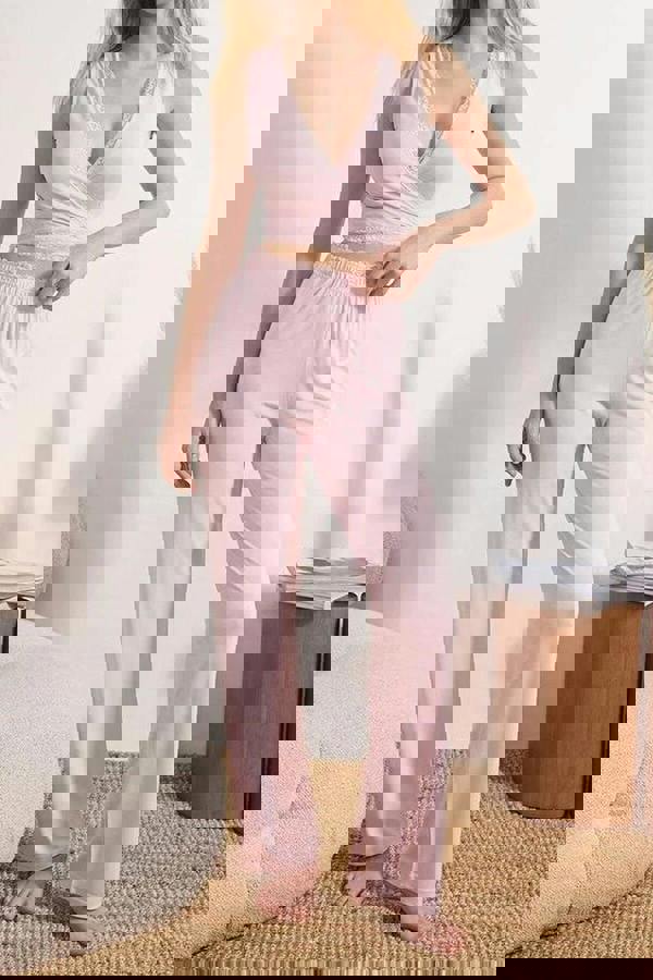 This coordinated two-piece set includes a matching top and bottoms, ideal for relaxed wear at home and settling in for the night.
