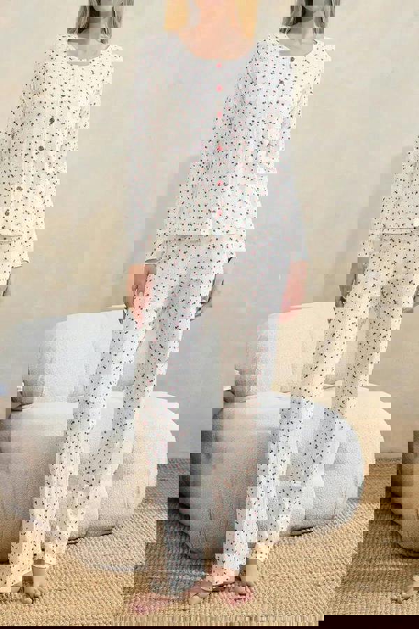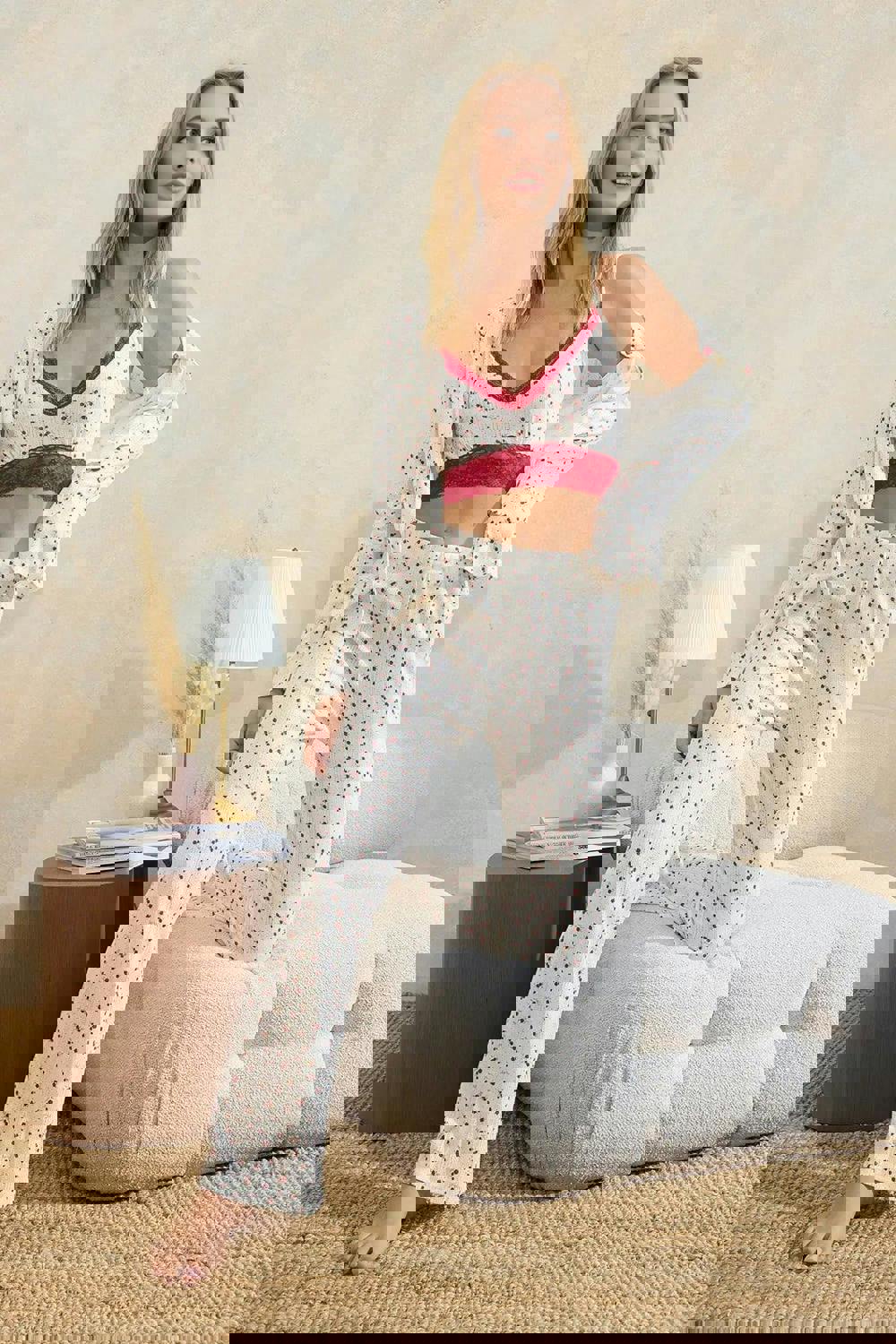 The coordinated three-piece set is intended to be worn together as a complete look, making it a versatile addition to a sleepwear rotation.