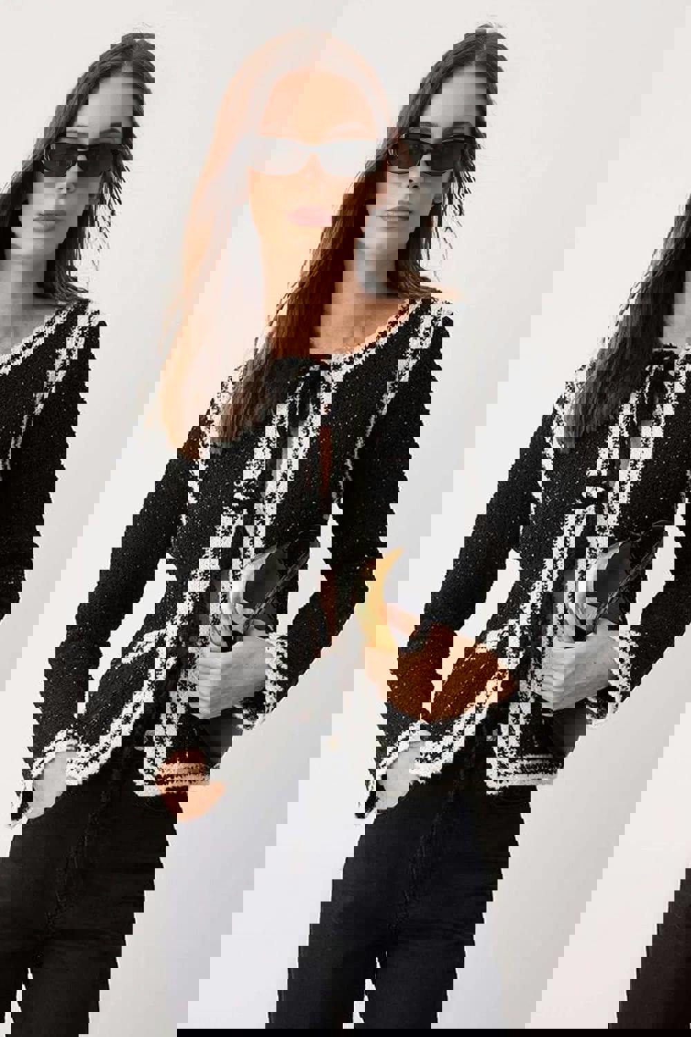 Colour and texture come together in the WOVCOR Color Block Glittery Knit Cardigan with Embroidered Detail. Made from a 75% acrylic and 25% polyester blend, it balances a soft handle with a structured feel. Colour-block panels bring a contemporary finish, while the glittery knit adds a subtle sheen.