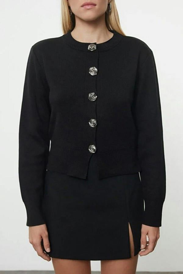 Finished with a rose button detail, it adds a delicate focal point while keeping the look clean and polished. Wear it over simple tops or dresses when you want a neat, cropped proportion.