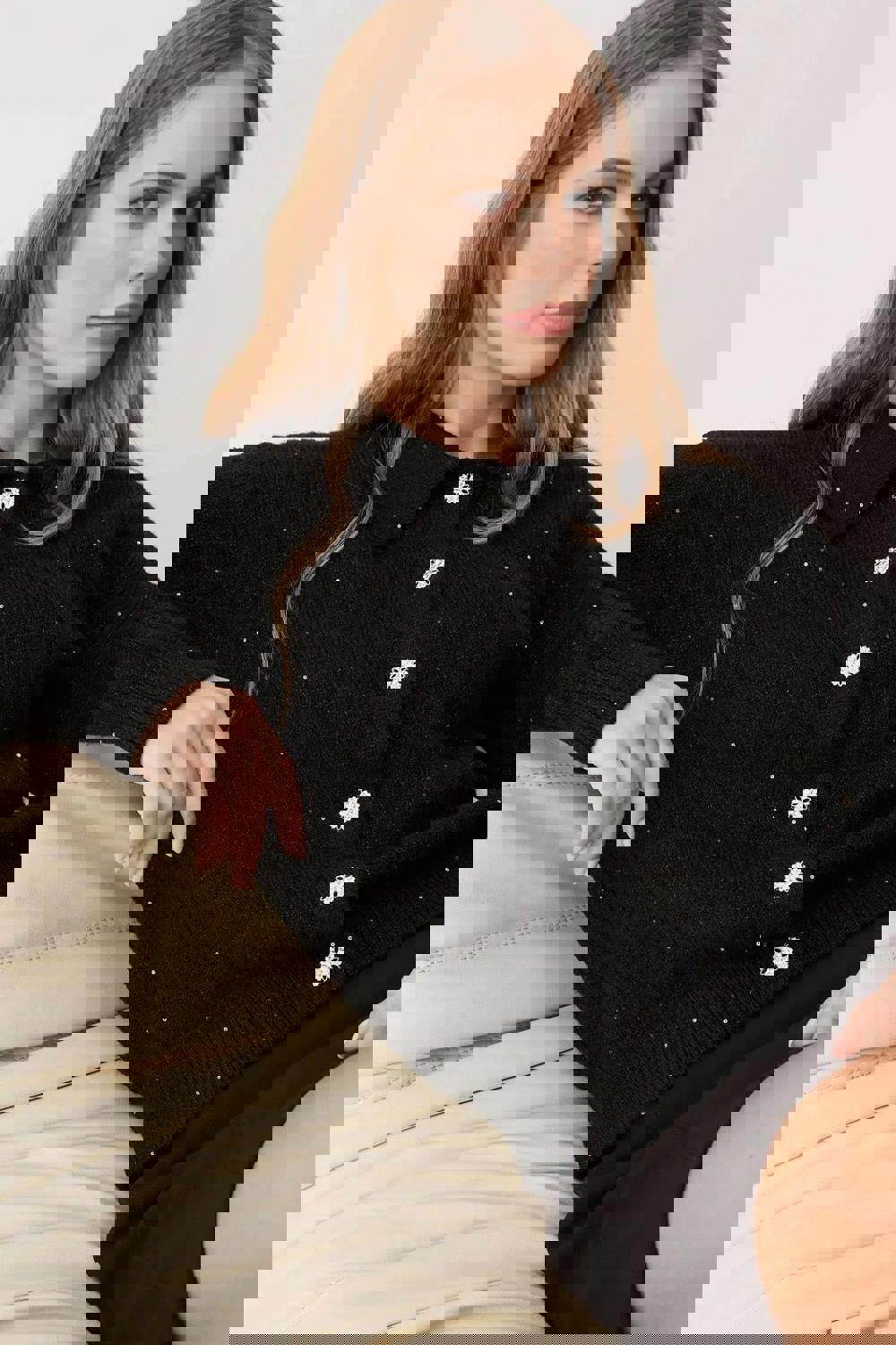 This cardigan suits moments when you want added texture and light-catching detail without losing the ease of a knit. The fibre mix balances a soft handle with a practical, wearable feel for day-to-night dressing.
