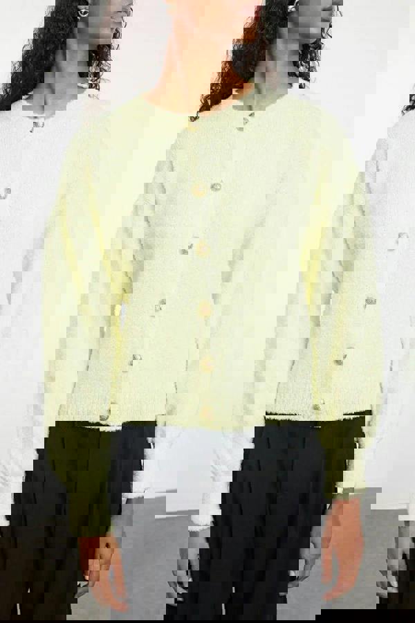 A soft-textured knit cardigan with button detail and balloon sleeves brings a contemporary shape to everyday layering. WOVCOR’s Soft-Textured Knit Cardigan with Button Detail and Balloon Sleeves is made from a blend of 73% acrylic and 27% polyester, combining a plush handle with a clean, wearable finish.