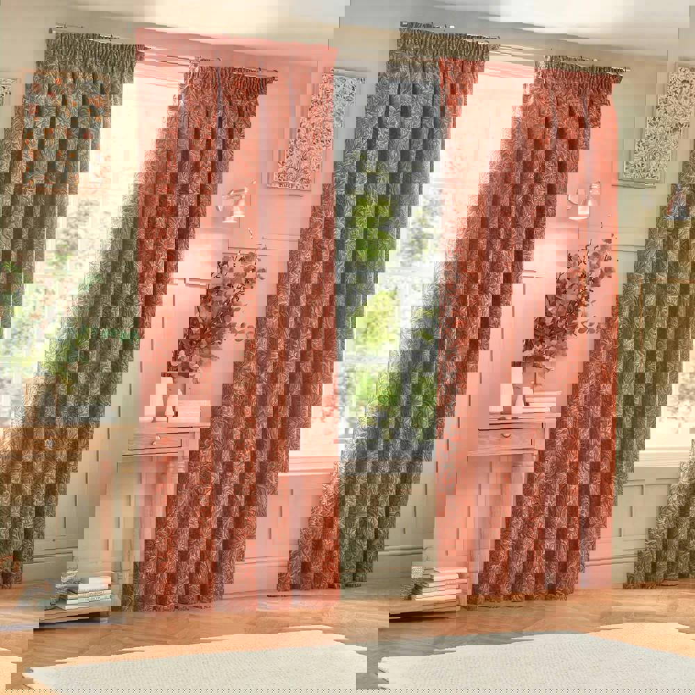 The Wylder Nature Grantley Jacquard Pencil Pleat Curtains in Brick are designed to bring a botanical, floral look to your window dressing. Featuring a textured finish, the woven jacquard fabric combines a slub effect with a soft-touch feel, adding visual interest and a more tactile finish to the room.
