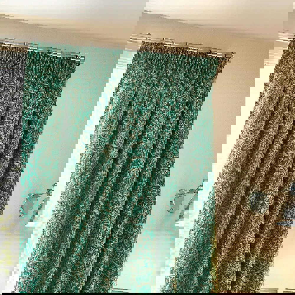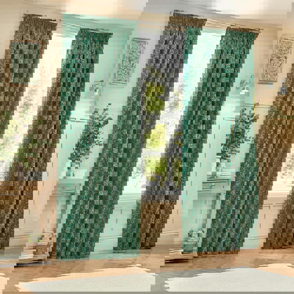 The Wylder Nature Grantley Jacquard Pencil Pleat Curtains in Emerald are designed to bring a distinctive botanical, floral look to your window. Featuring a textured finish and a soft-touch feel, the woven jacquard slub fabric adds visual interest while keeping the overall look refined and considered.