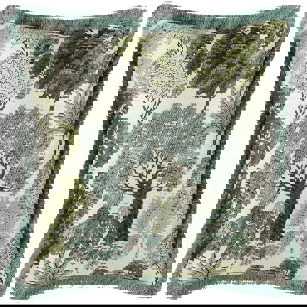 Bring a considered finishing touch to your sofa, armchair or bed with the Wylder Nature Woodlands Jacquard Floral Cushion Cover in green. Designed to refresh your space with minimal effort, it features a woven jacquard front with a woodland-inspired floral pattern, combining trees and square motifs for a distinctive look.