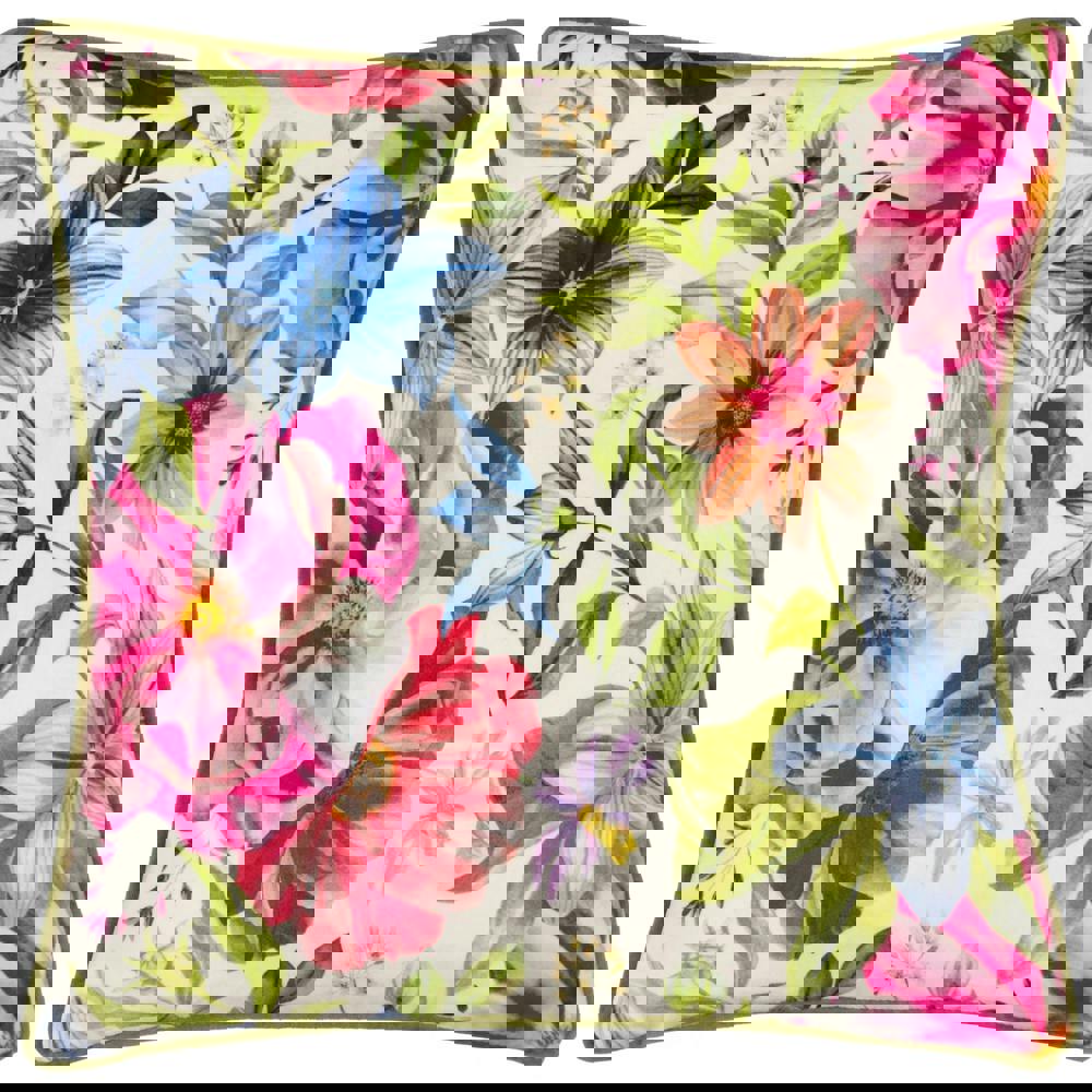 The Wylder Nectar Garden Petunia Piped Velvet Floral Cushion Cover in cream is designed to refresh your living space with a floral finish on the front and a plain reverse. Made from 100% polyester velvet, it offers a soft feel while remaining durable for everyday use.