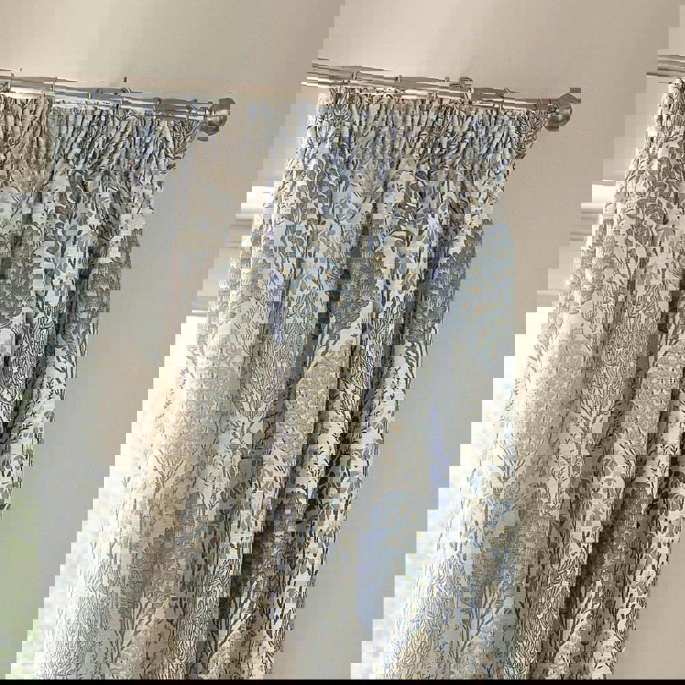 The Wylder Ophelia Jacquard Floral Pencil Pleat Curtains in Wedgewood are designed to bring a decorative finish to your window, with an all-over botanical print. Made from 100% polyester, they feature a soft-touch woven jacquard fabric that adds texture and detail to the look.
