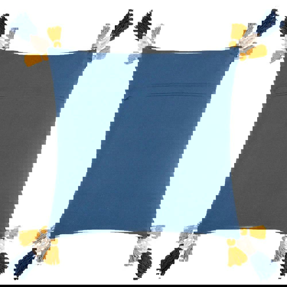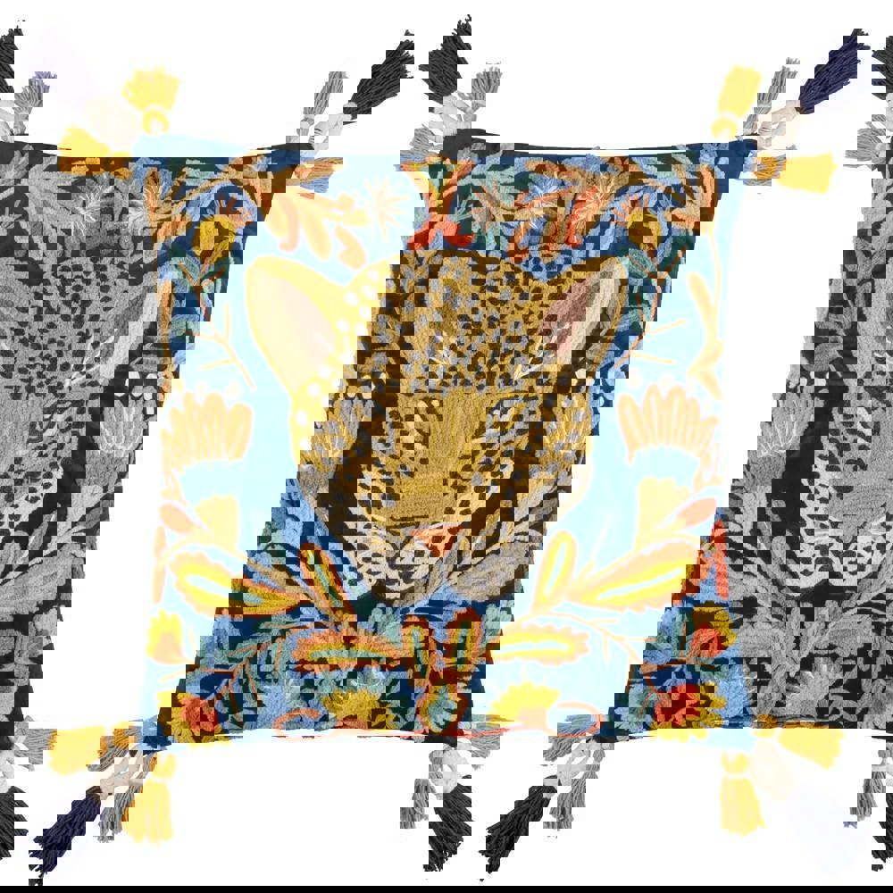 This cushion cover features embroidered detailing with a floral and leopard design, finished with tufted accents and tassel trim for added texture. A plain reverse offers a simpler alternative when you want a more understated look, and the zip fastening makes it straightforward to fit and remove as needed. Please note: insert not included.